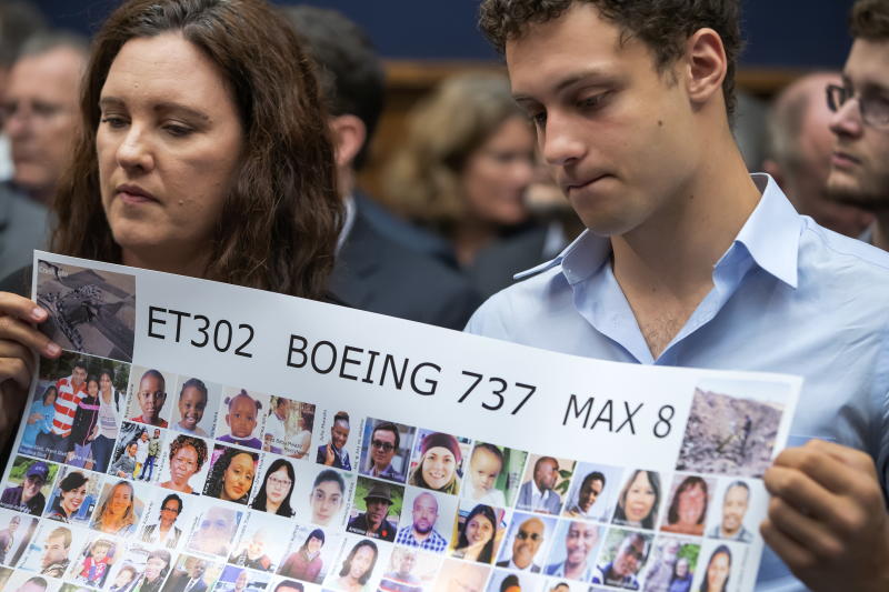 A photo taken on July 17 shows family members of Ethiopian Airlines Flight 302 crash victims during a hearing of the House Transportation and Infrastructure Committee's Aviation Subcommittee on the State of Aviation Safety at Capitol in Washington.