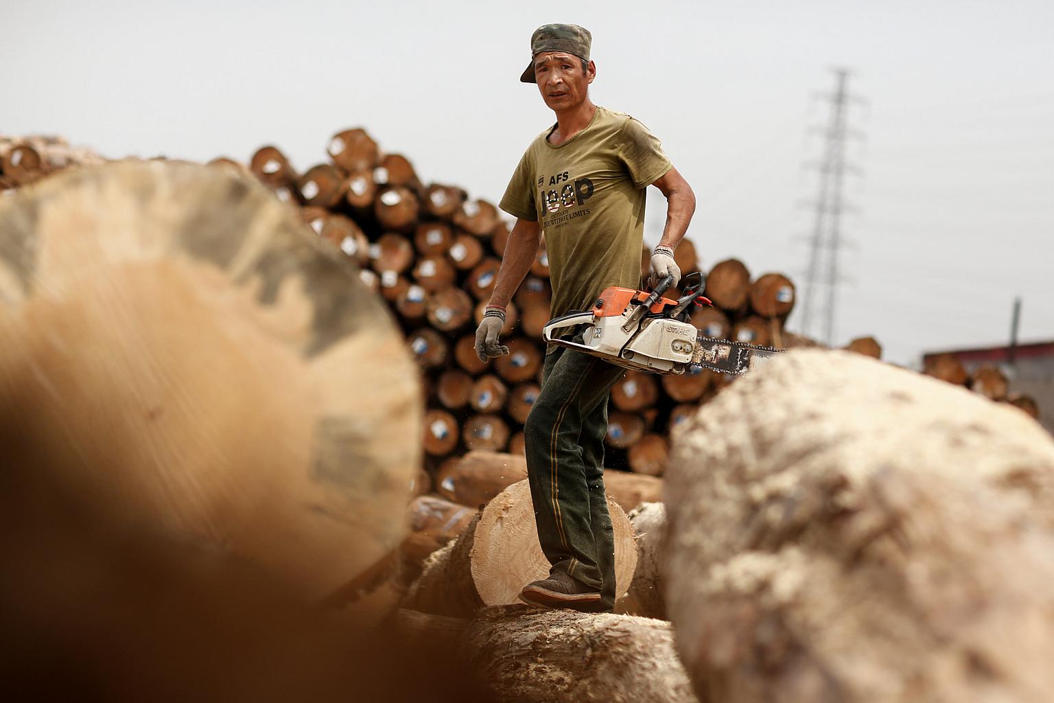 A worker holds a chain-saw to cut timber at a woodyard in Tianjin, China. There are hundreds of items on the Trump administration's proposed list of Chinese imports to be targeted for new US tariffs, including things like grenades, bombs and even chain-saws.