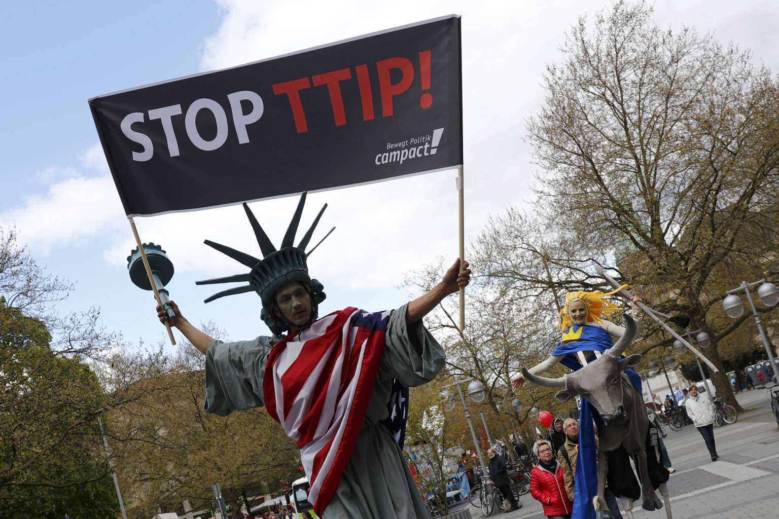 Protesters demonstrate against the TTIP free trade agreement ahead of a visit by US President Barack Obama in Germany, April 23, 2016.