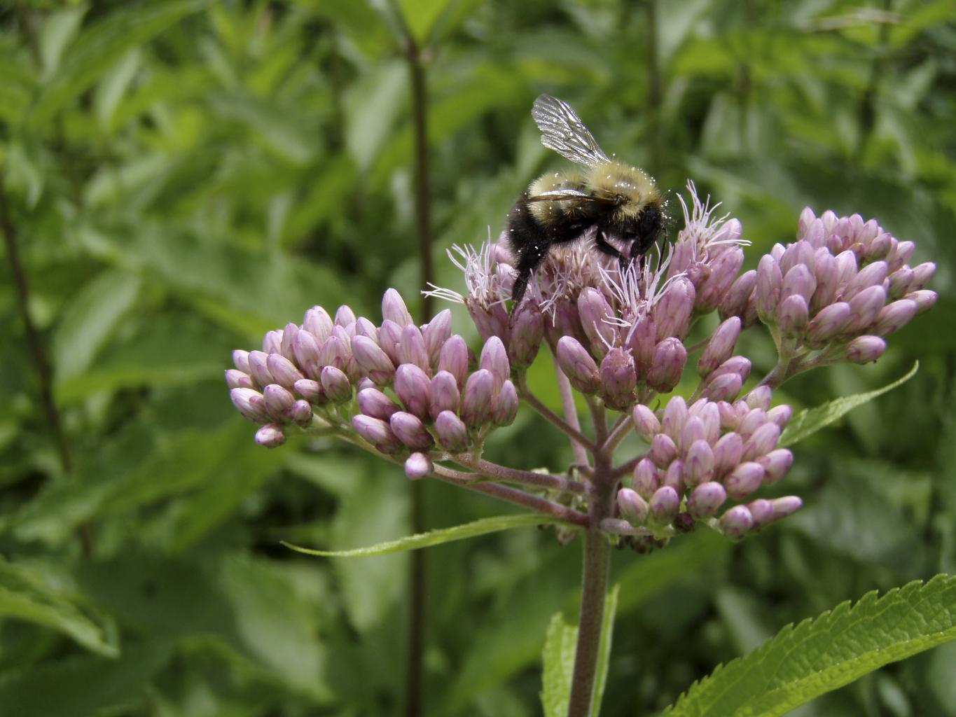 A bumblebee forages on a flowering joe-pye-weed in Vermont, in the United States.
