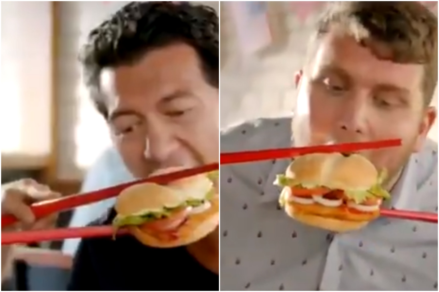 The fast-food chain's video clip showed diners very awkwardly trying to eat its new Vietnamese Sweet Chilli Tendercrisp burgers with giant red chopsticks.