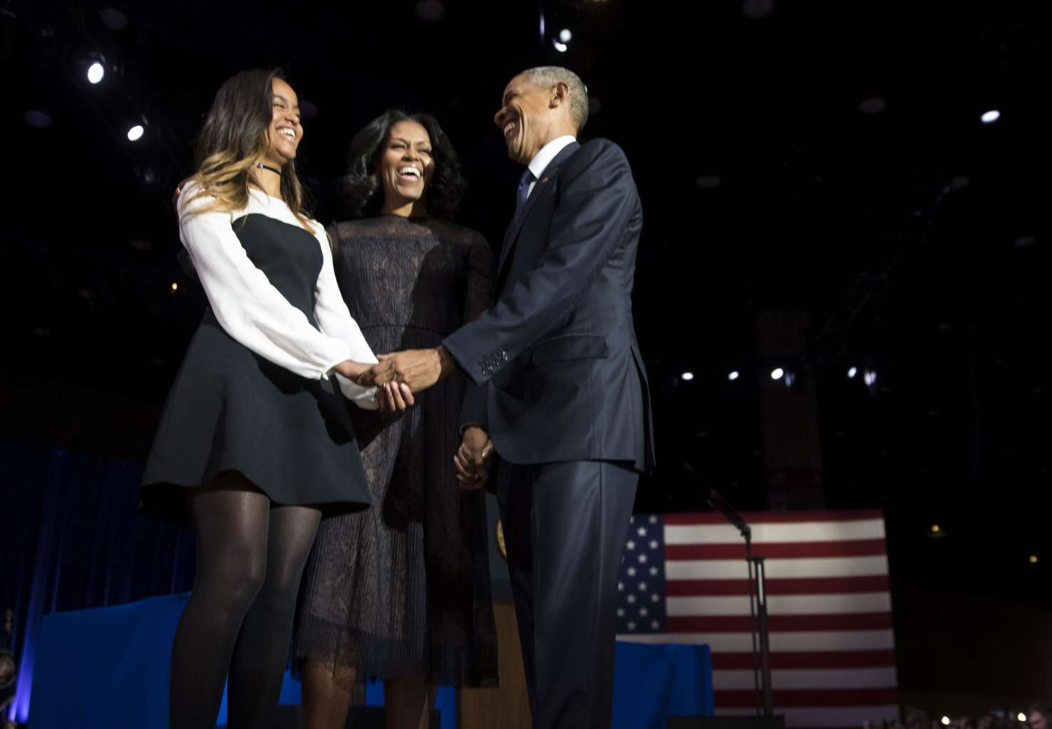 Malia Obama (left) with her parents at US President Barack Obama's farewell address in Chicago on Jan 10, 2017.