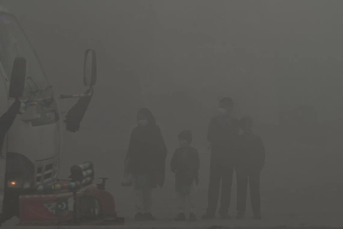 Schoolchildren make their way along a street amid heavy smog, in Pakistan’s Lahore.