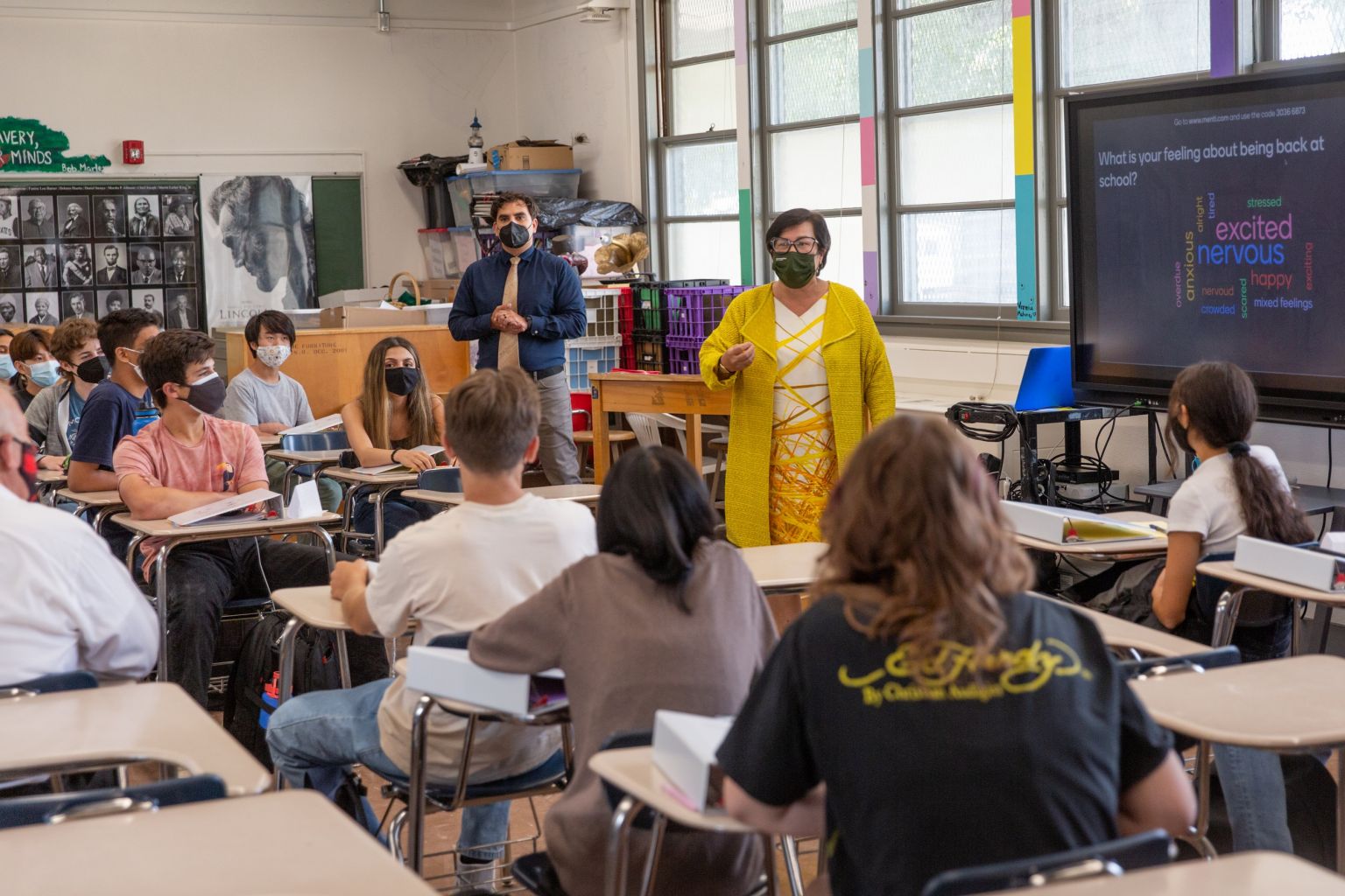 Students are welcomed on the first day of school at Grover Cleveland Charter High School near Los Angeles in August 2021.