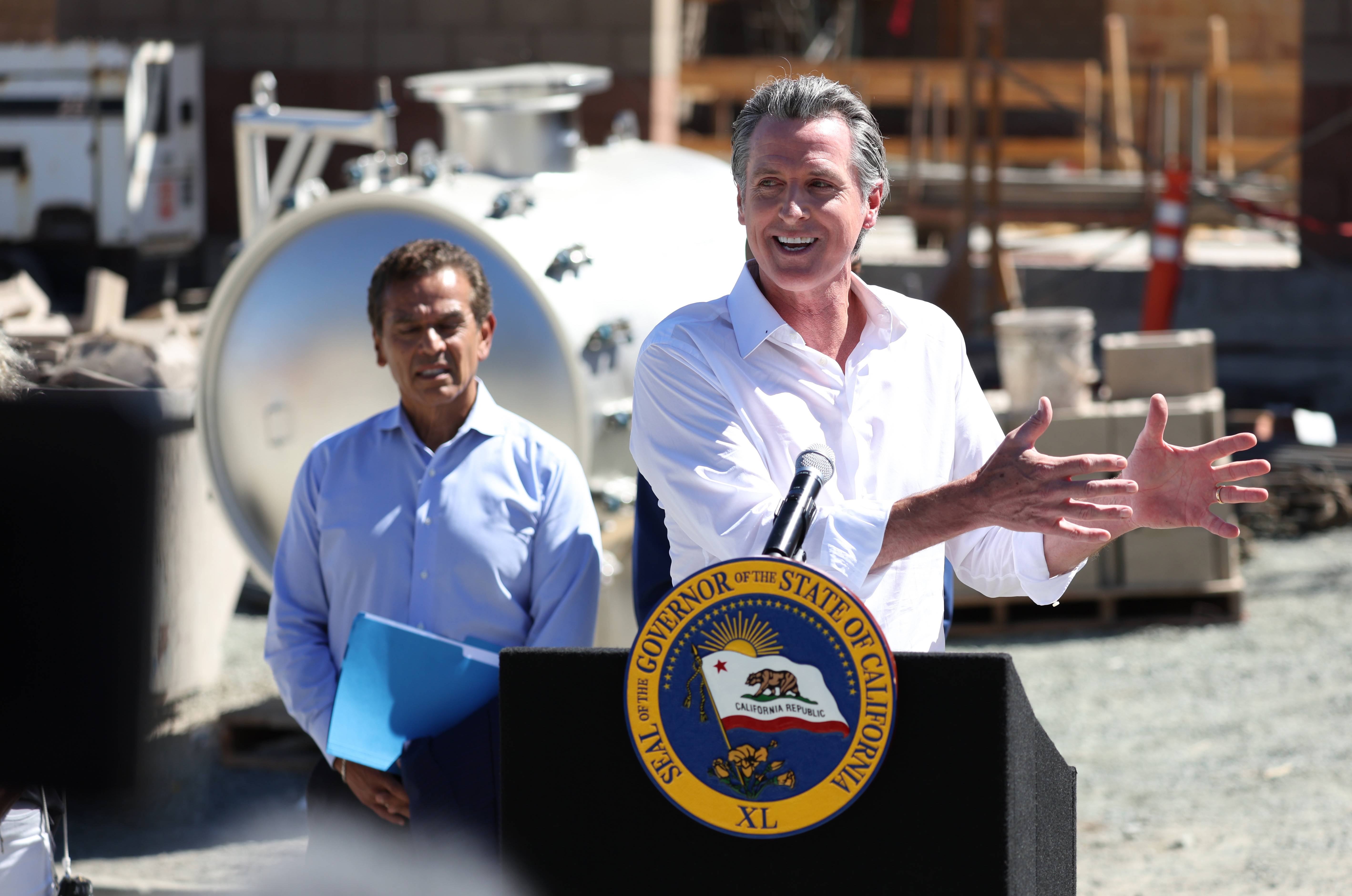 California Governor Gavin Newsom speaks during a visit the Antioch Water Treatment Plant in California on Aug 11, 2022.