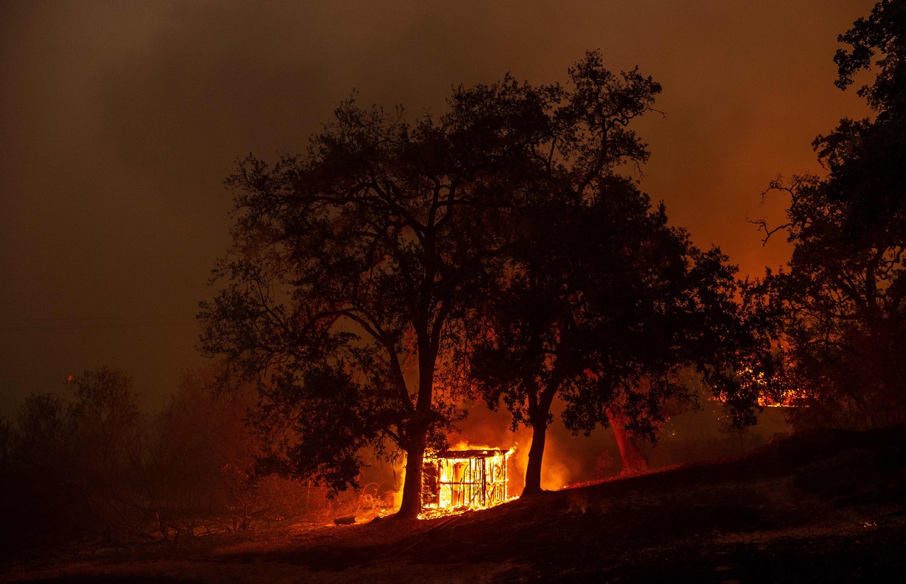 A structure burns during the Glass Fire in St. Helena, California, on Sept 27, 2020.