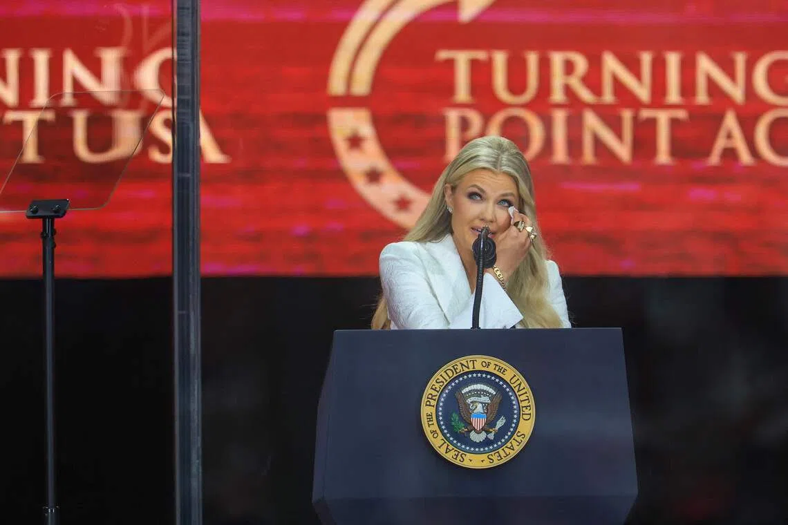 Mr Charlie Kirk’s wife Erika speaking during the memorial service on Sept 21.