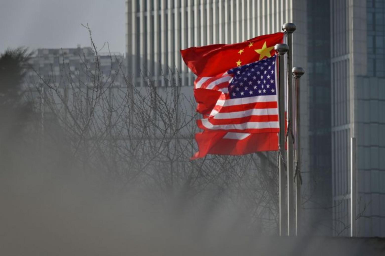 In a photo taken on Jan 18, 2020, Chinese and US national flags flutter at the entrance of a company office building in Beijing.