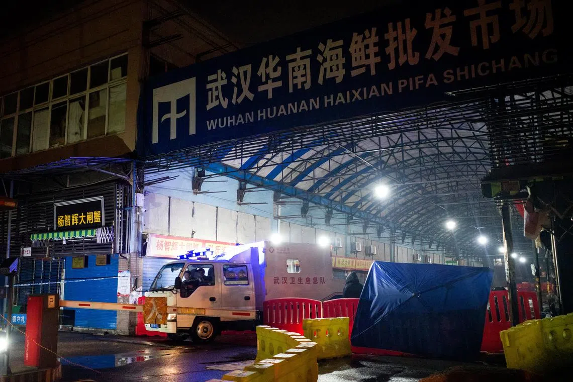 Wuhan Hygiene Emergency Response Team’s staff leaving the closed Huanan Seafood Wholesale Market in Wuhan, China, in January 2020.