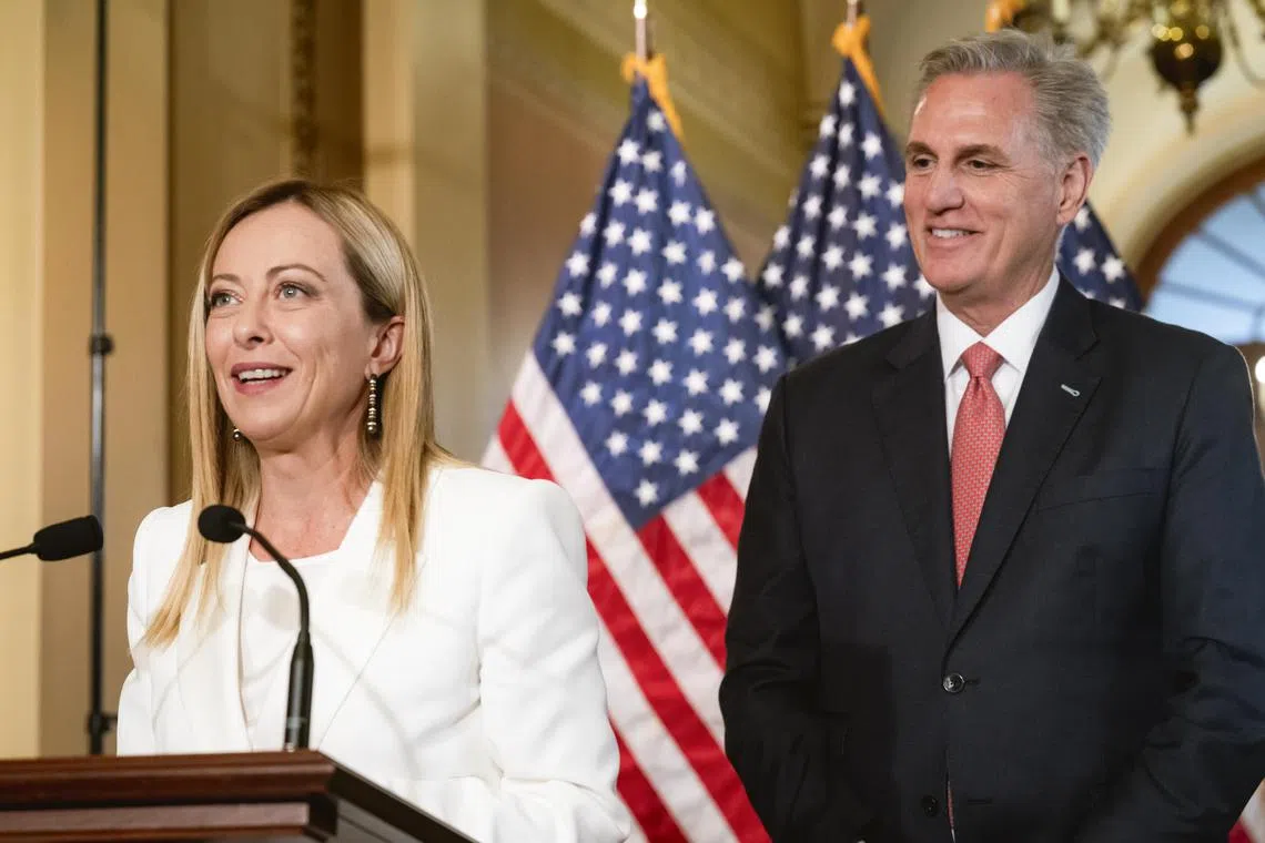 Italian PM Giorgia Meloni (left) speaks to reporters alongside US Republican House Speaker Kevin McCarthy.