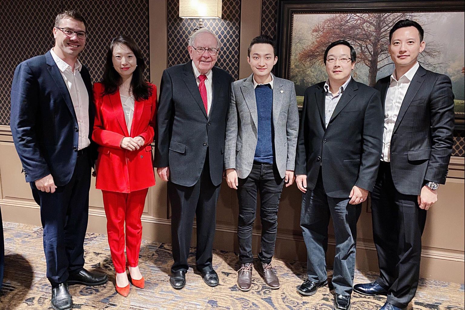 Entrepreneur Justin Sun (third from right) met investor Warren Buffett (third from left) in Omaha, Nebraska.