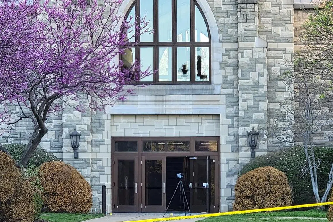 The second storey broken windows, where the shooter fired from on arriving police vehicles, at the Covenant School building at the Covenant Presbyterian Church, in Nashville, Tennessee.