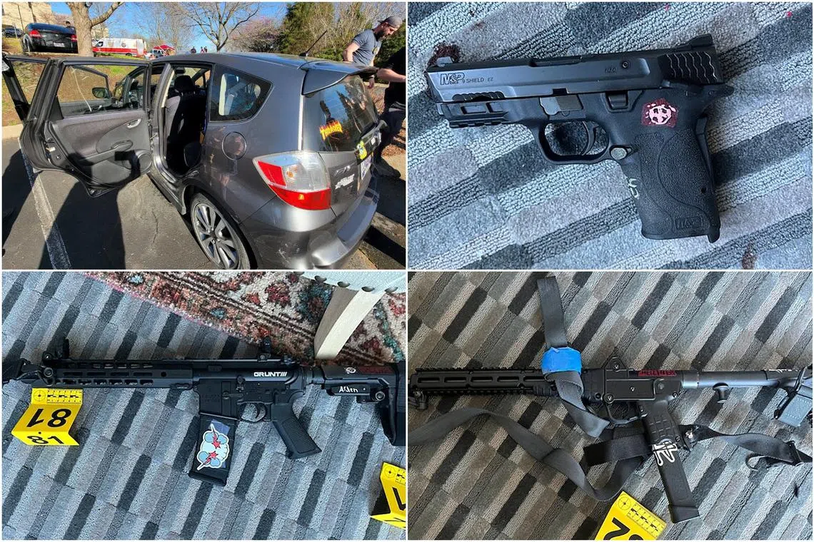 (Clockwise from left) The vehicle and the weapons used by the suspect.