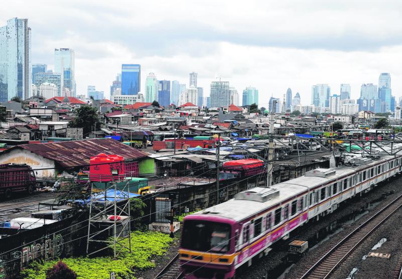 A commuter train is seen against the backdrop of high-rise buildings at Tanah Abang district in Jakarta, Indonesia, on Jan 19, 2018.
