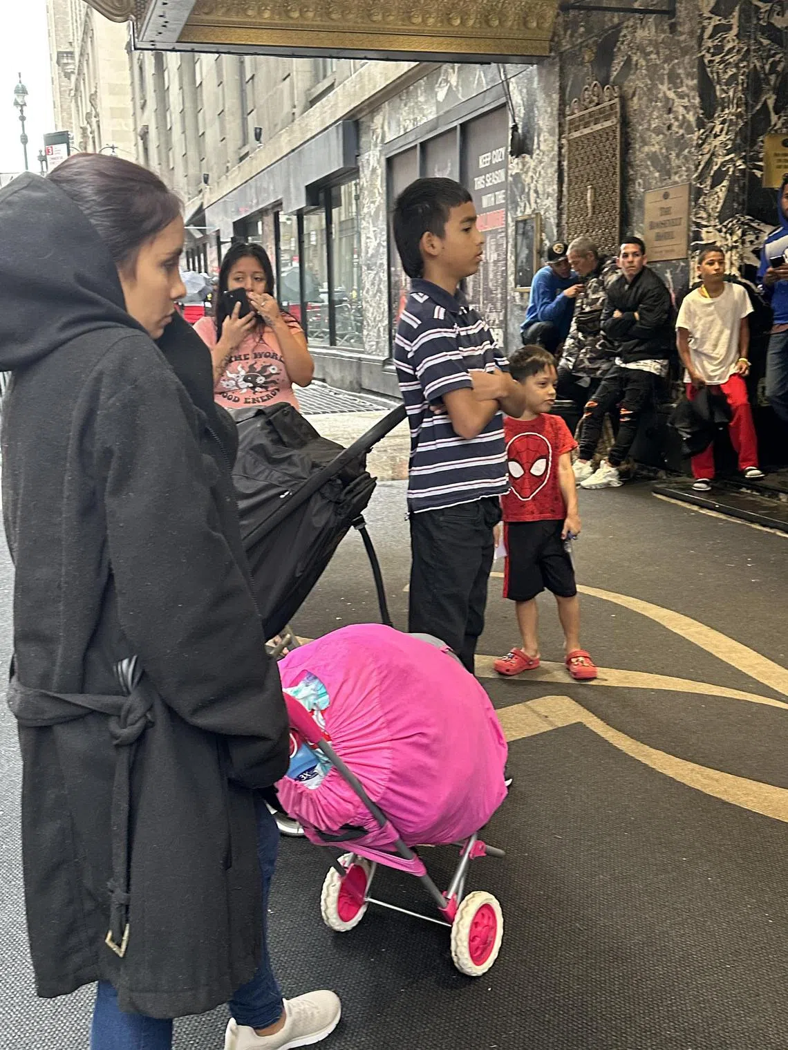 The hotel is now the main processing centre for thousands of immigrant families from Central and South America. The city authorities have not stated exactly how many are lodged in its 850 rooms. The front doors push open every few minutes to reveal a dimly lit lobby in which families huddle quietly.