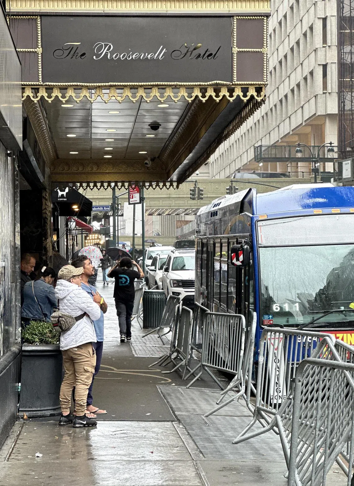 At the other entrance to the hotel, barricades stretched over puddles of rainwater and two security vans idled on the sides of the road. Here too, families ventured in and out under the careful watch of security guards, holding hands, distinct in their tentativeness and timidity from the brisk New Yorkers.