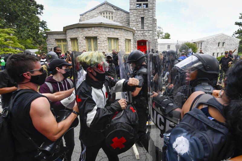 Swat police being confronted by far-left protesters marching to break up a rally in Stone Mountain, Georgia, on Aug 15, 2020.