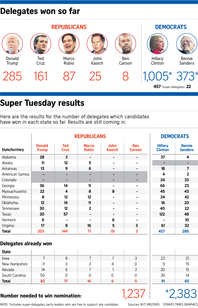 Democrat Hillary Clinton and Republican Donald Trump were the big winners on the most important day of voting in the nominating race for the United States presidential election, proving themselves the undisputed front-runners of their parties on Tuesday (March 1).