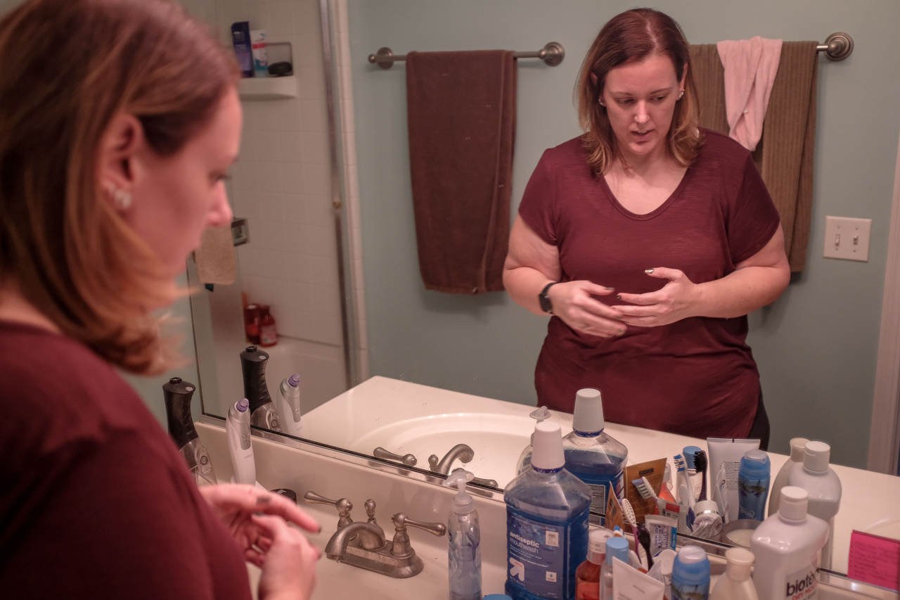 Ms Samantha Lewis in her bathroom, where an index card helps remind her how to brush her teeth.