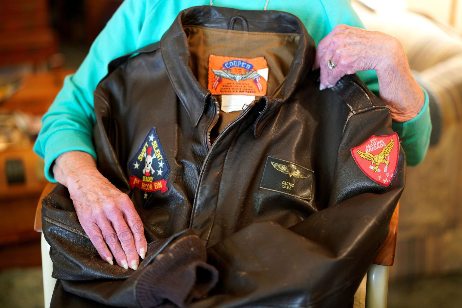 In a photo taken on Dec 16, 2017, Mrs Shirley Hollenback, wife of Gerald "Cactus" Hollenback, whose husband's ashes were lost by Sunset Mesa Funeral Directors, poses with his Marine Corps bomber jacket in her home in Montrose, Colorado.