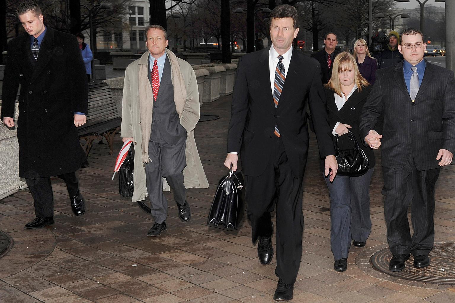 Blackwater Worldwide security guards Evan Liberty (left) and Dustin Heard (right) leave the federal courthouse with their legal team and supporters, on Jan 6, 2009.