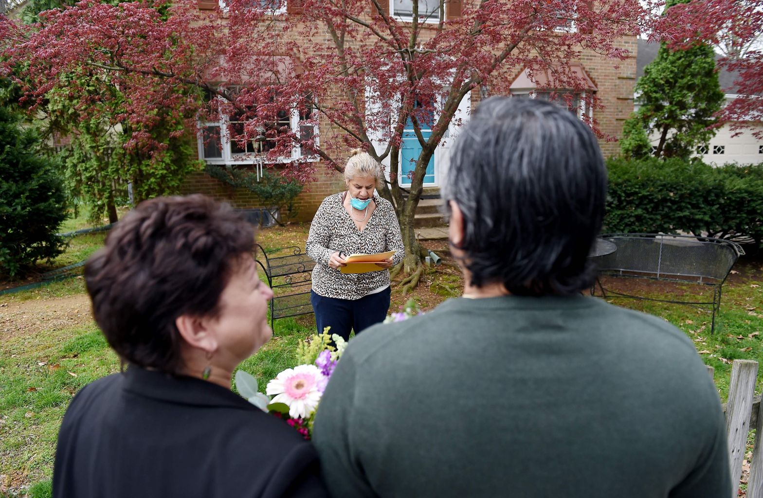 A Virginia State Marriage offcial performs a ceremony while maintaining social distance on April 1, 2020 in Arlington, Virginia.