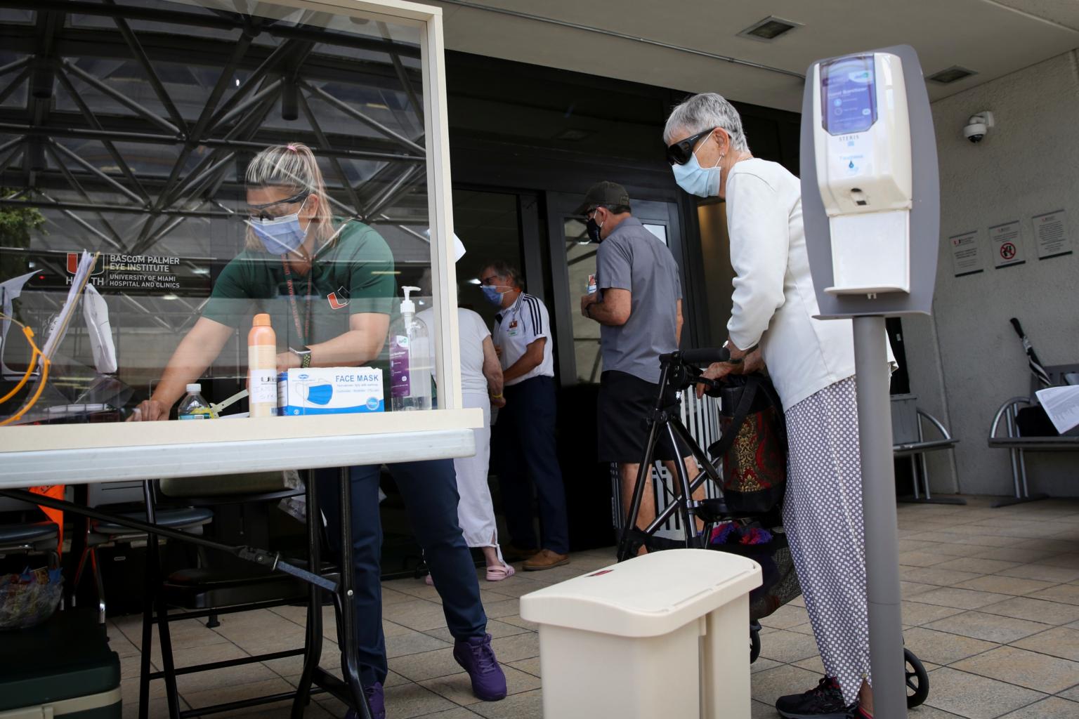A woman waits for a health assessment check-in before entering Jackson Memorial Hospital in Miami on June 18, 2020.