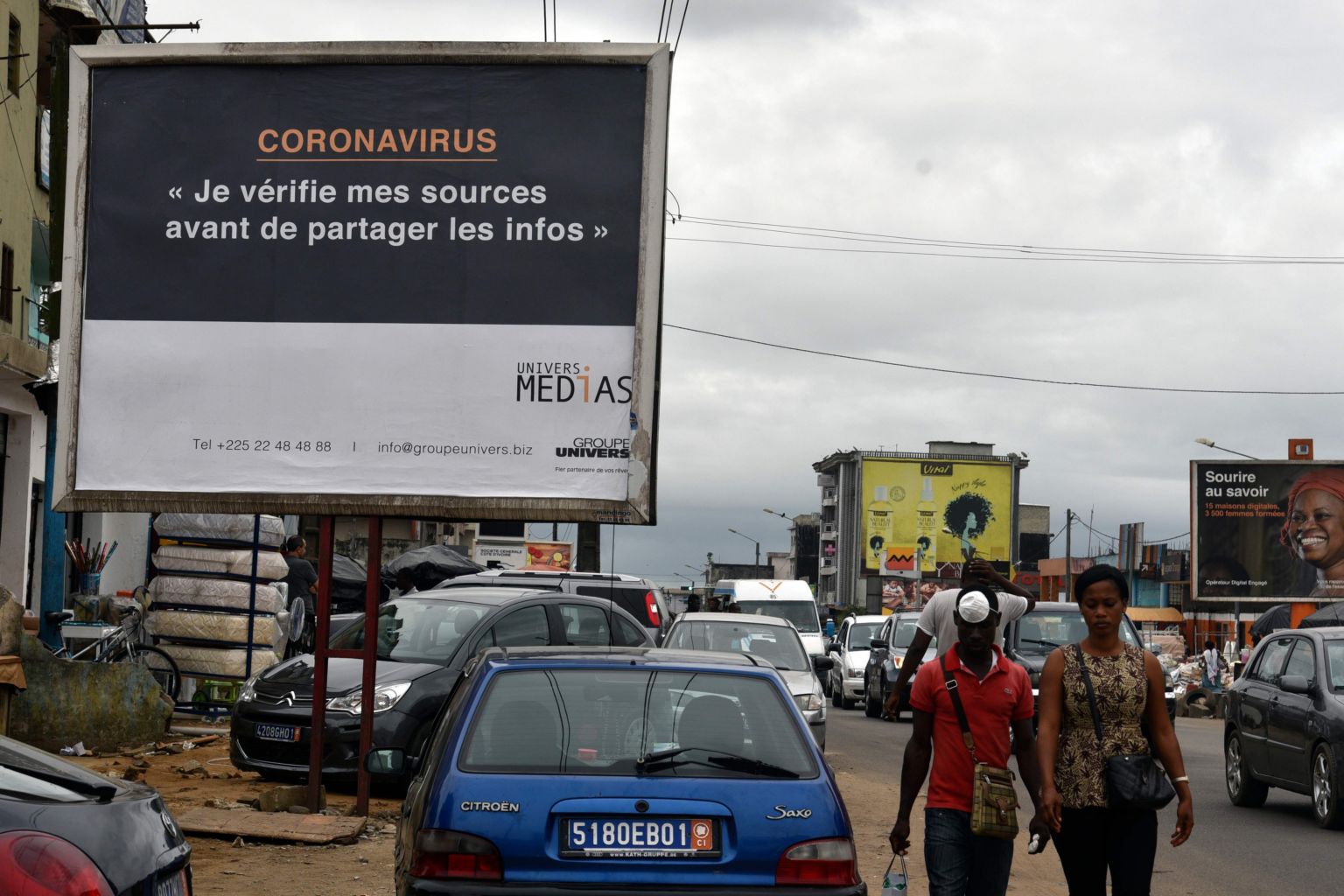 People walk past a sign reading "coronavirus - I check my sources before sharing news" to warn people about fake news in Abidjan on March 24, 2020.