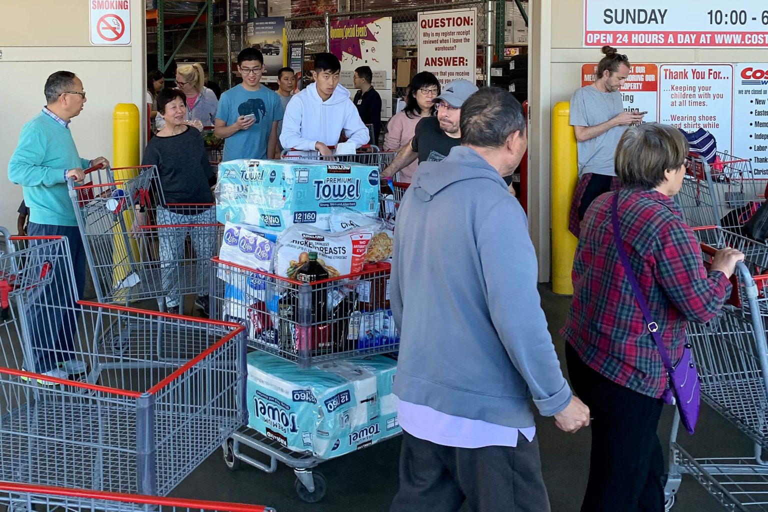 Shoppers buy toilet paper, food and water at a store in Los Angeles on Feb 29, 2020.