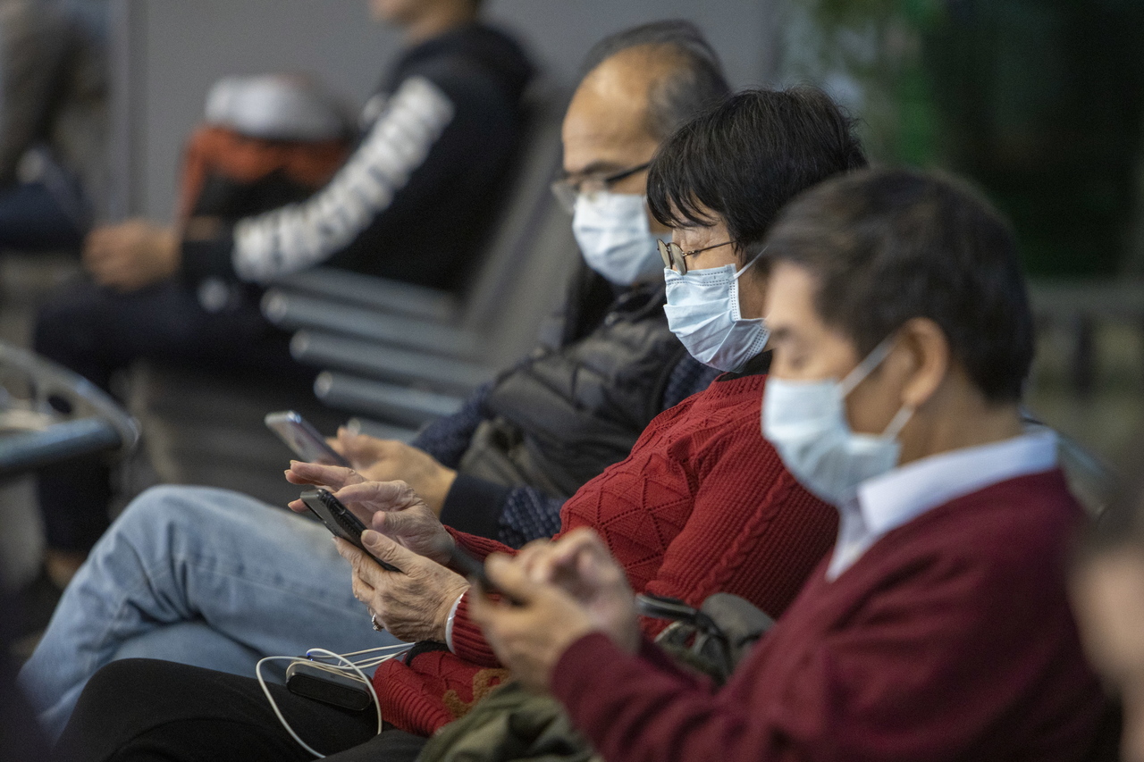Travellers wear protective face masks in the arrival area at San Francisco International Airport on Feb 7, 2020.