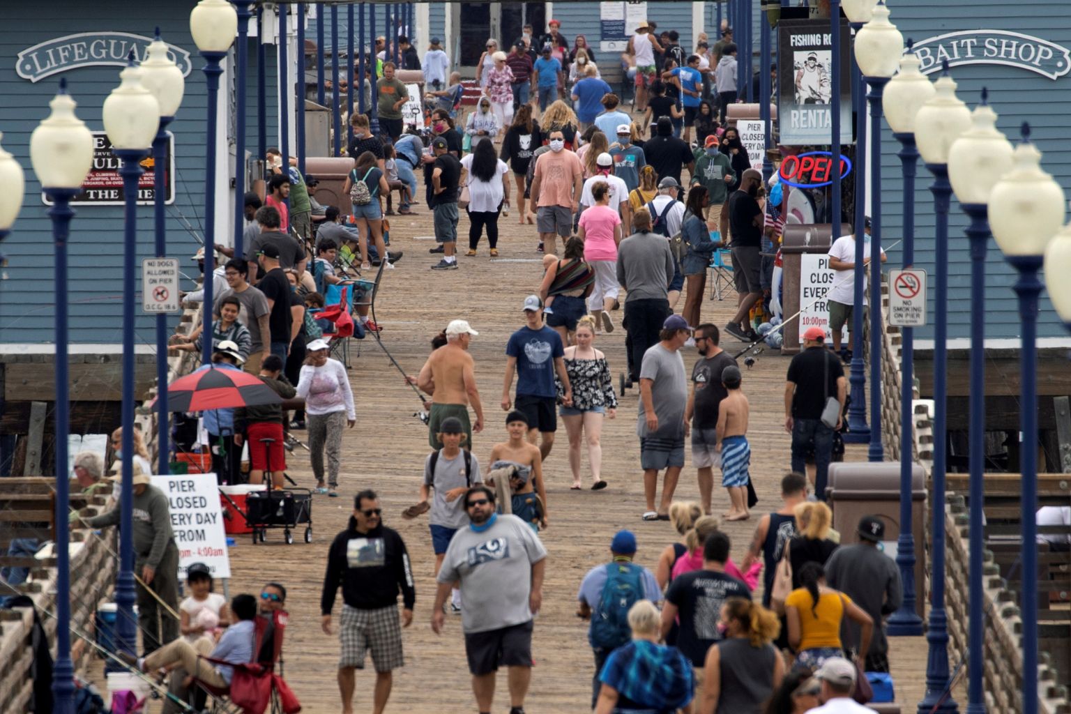 Few people wear masks as they walk along a pier in Oceanside, California, June 22, 2020.