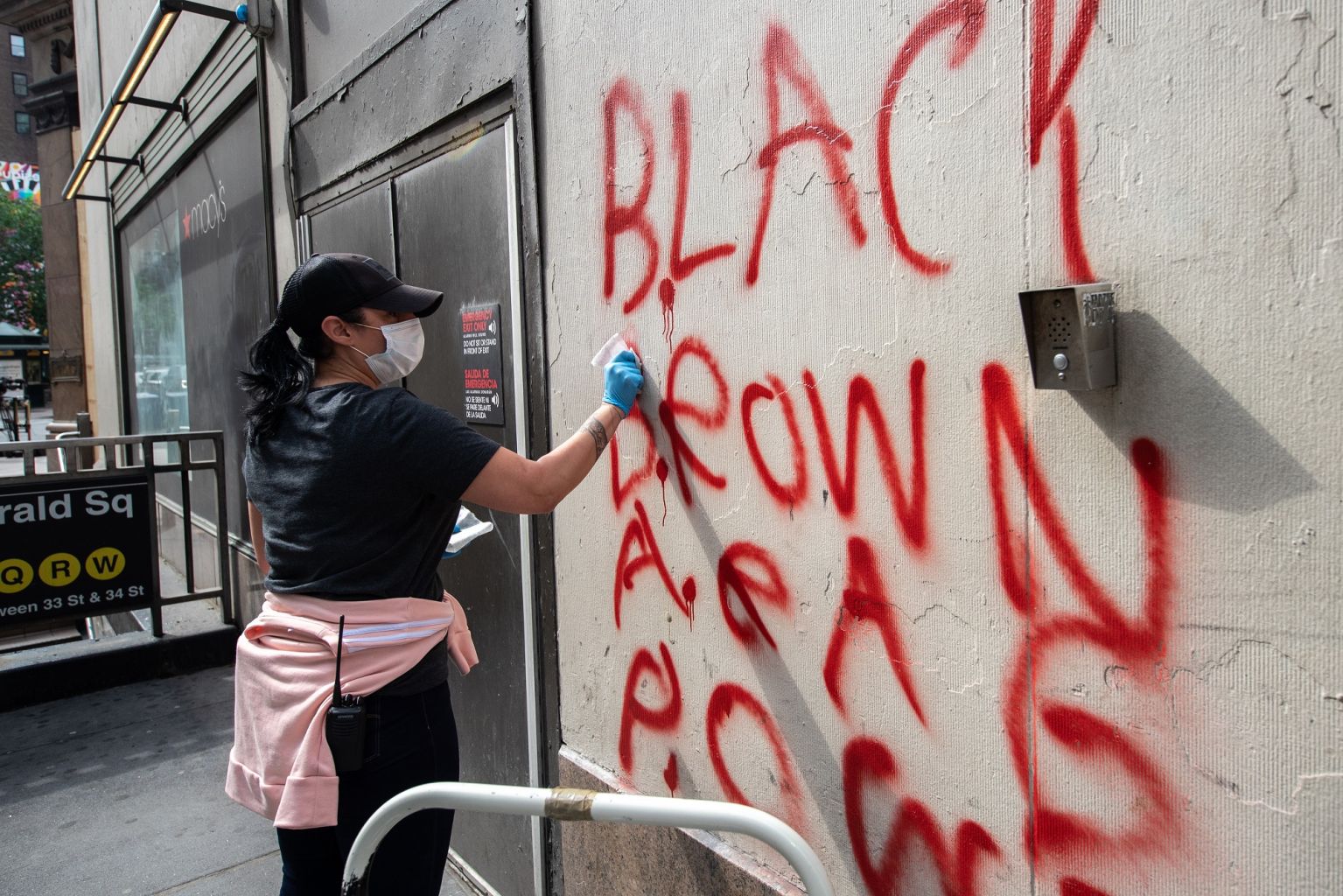 A worker removes graffiti at Macy's after protests in New York, on June 3, 2020.