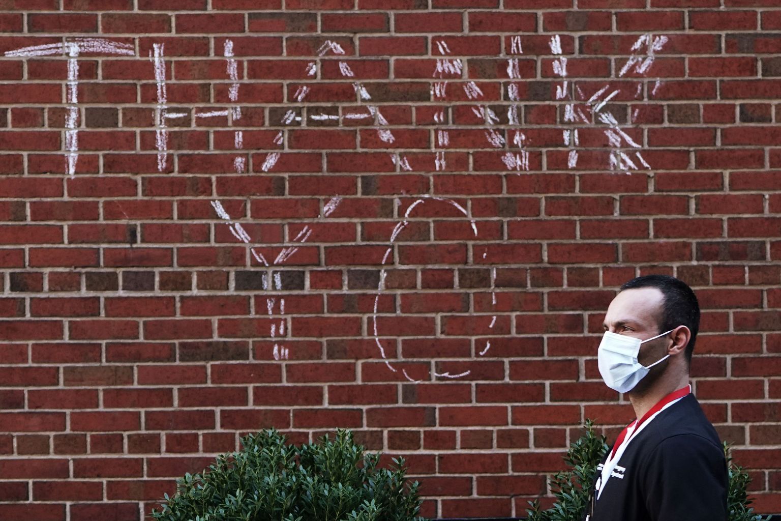 A hospital worker walks past a sign of thanks on a wall in New York City, April 1, 2020.