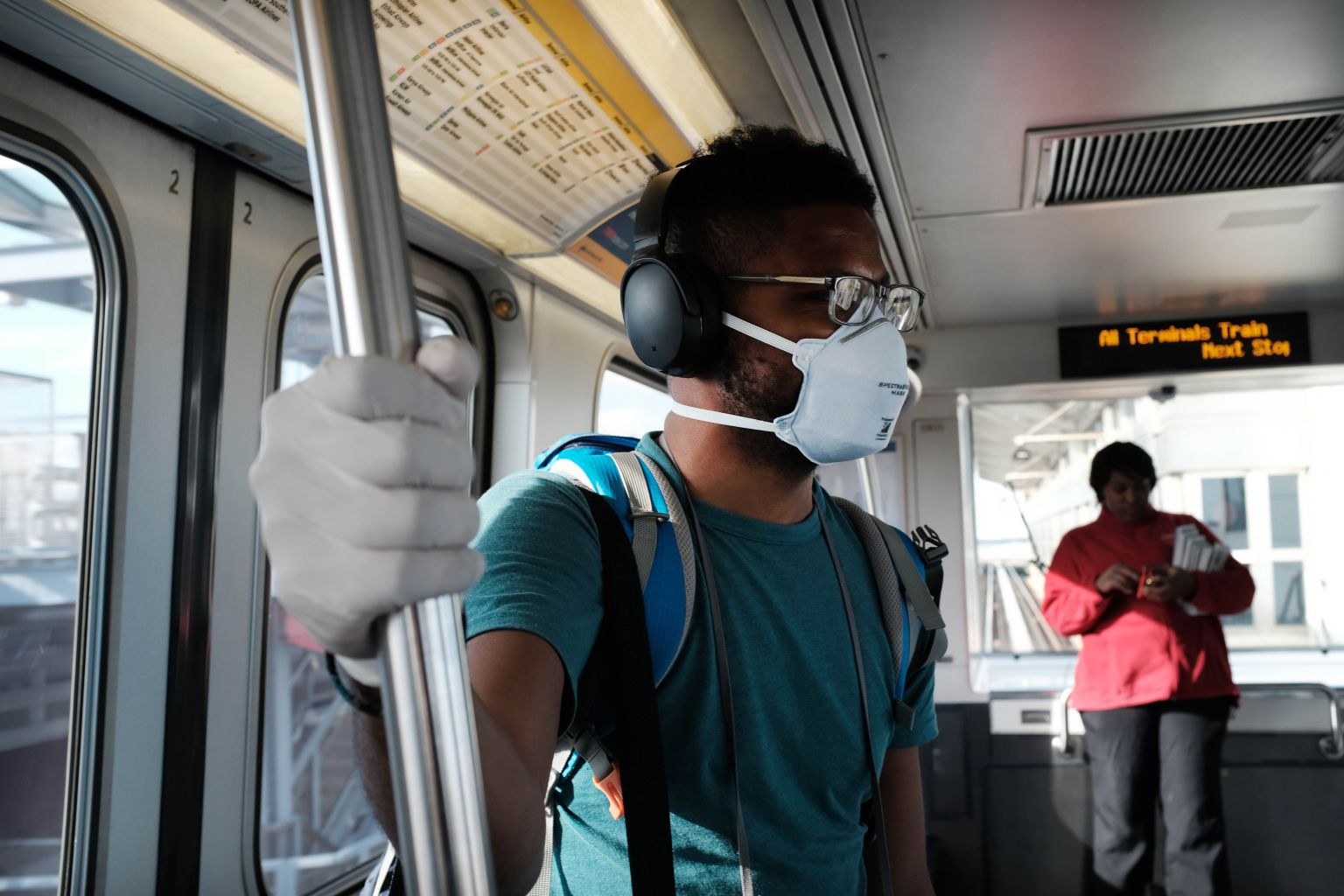A man wears a medical mask on the AirTrain en route to John F. Kennedy Airport on March 7, 2020 in New York City.