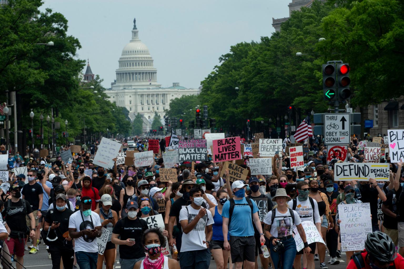 A crowd of protesters walk during a protest against police brutality and racism, on June 6, 2020, in Washington, DC.