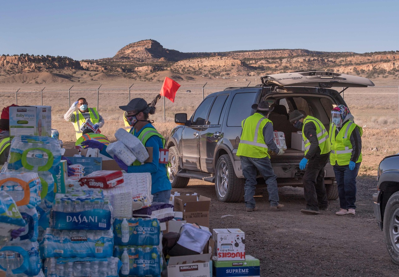 Native Americans of the Navajo Nation people pick up supplies from a food bank in New Mexico on May 20, 2020.