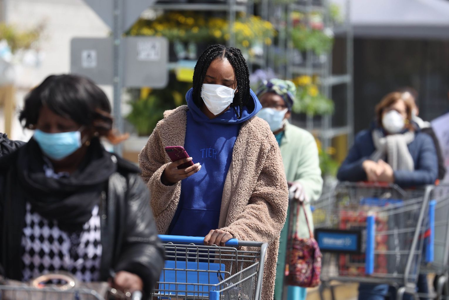 People wearing masks and gloves wait to enter a Walmart on April 17, 2020 in Uniondale, New York.
