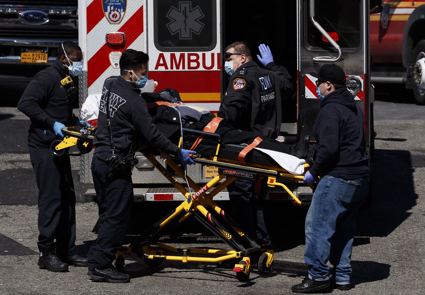 Medical staff transport a person into the emergency room at Elmhurst hospital centre, which has seen a large proportion of New York's coronavirus-related deaths.