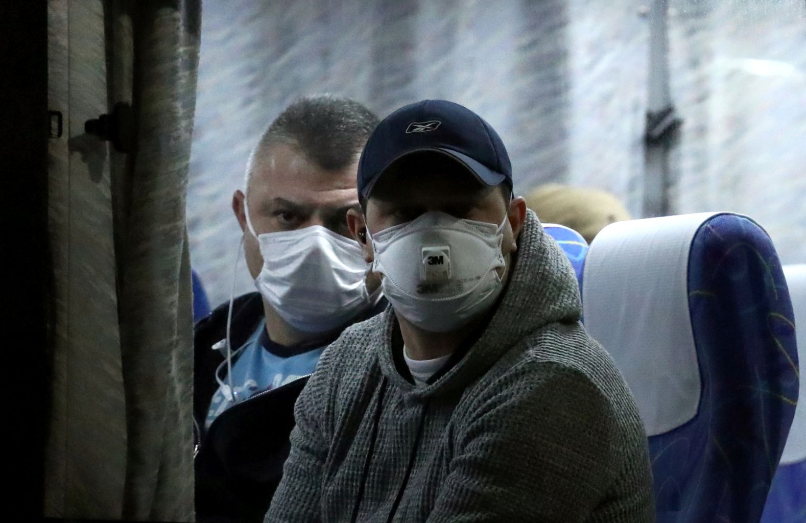 Passengers look out from a bus as they leave the coronavirus-hit cruise ship Diamond Princess in Japan.