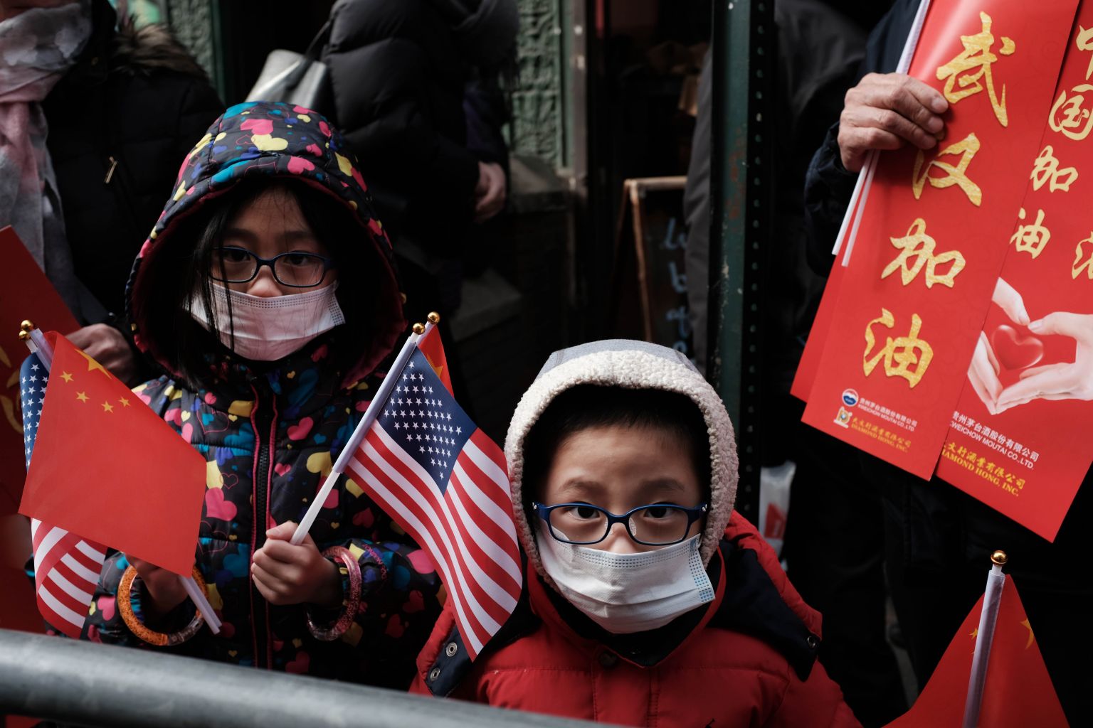 Children wearing surgical masks watch the annual Chinese New Year Parade in Manhattan's Chinatown on Feb 9, 2020 in New York City.