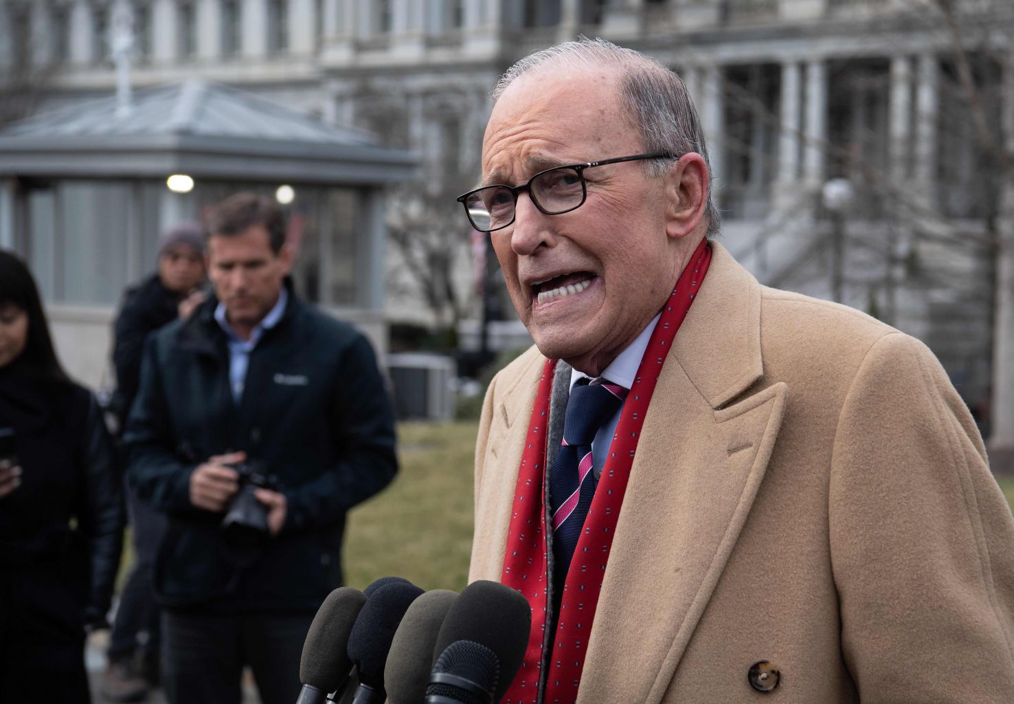 A January 2020 photo shows Kudlow speaking to the press at the White House in Washington.