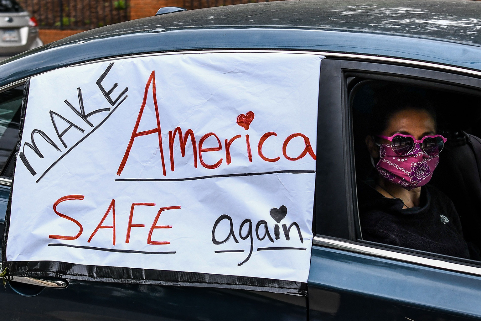 A demonstrator in a drive-by protest in the United States on Friday, amid lockdowns in several states in the country to try to curb the pandemic. A poll released this month showed a drop in President Donald Trump’s approval rating. Another poll found Americans to be less keen on voting.