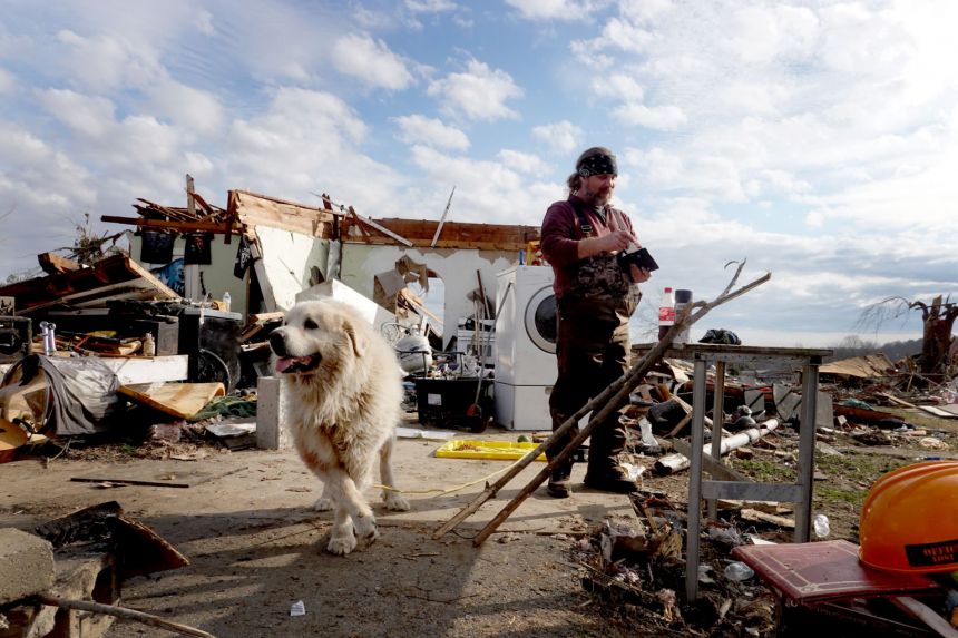 Duffy Adams and his dog Hoss recover items from their destroyed home on Dec 14, 2021.