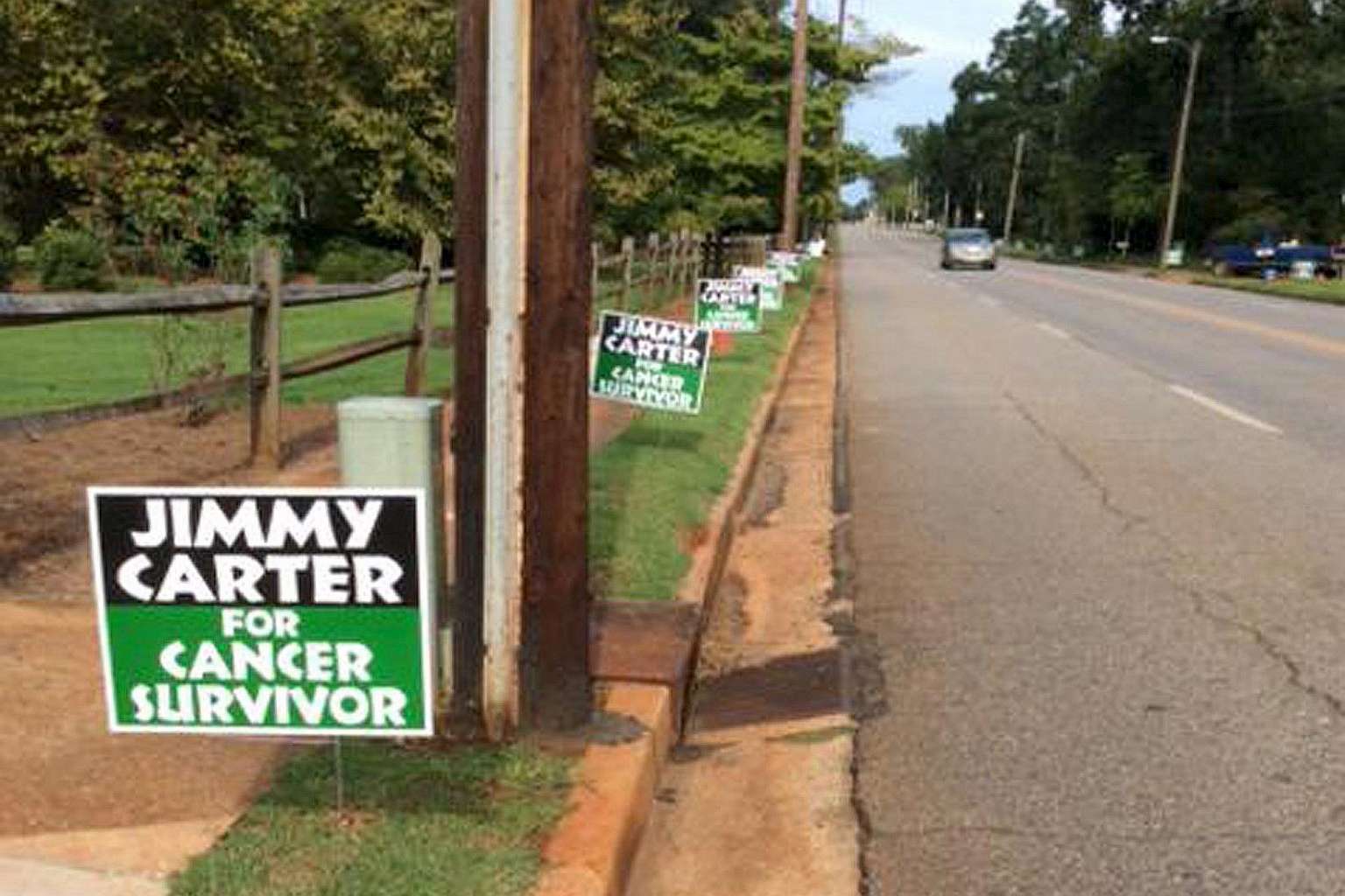 Lawn signs along a sidewalk is shown in this photo taken by former US President Jimmy Carter in Plains, Georgia.