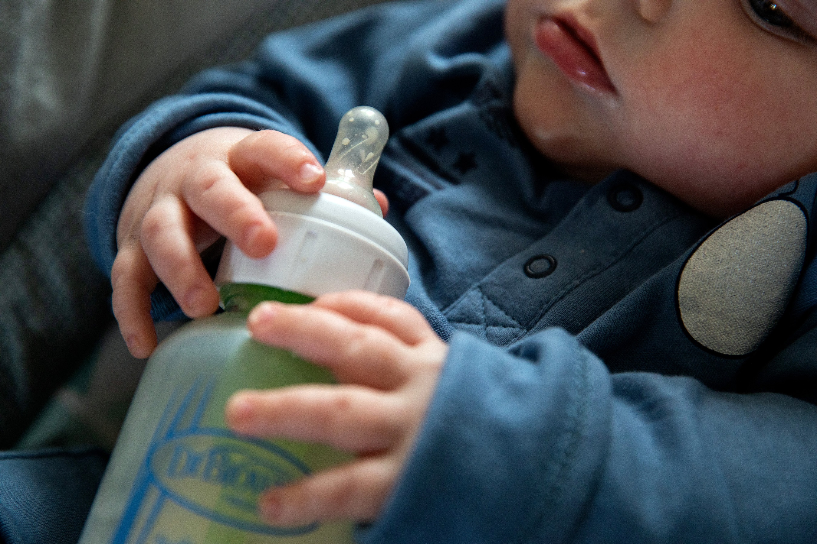 An infant is fed formula from a bottle in Plymouth, Massachusetts, on May 15, 2022.