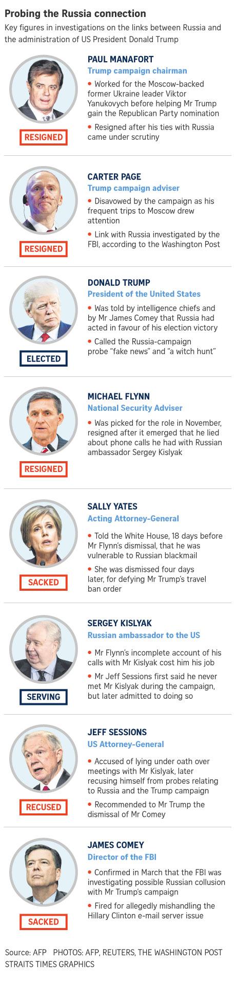 Many Democrats have criticised Comey's management of the Clinton investigation, but they questioned the timing of his dismissal, given that Trump could have acted soon after taking office on Jan 20 and that he has repeatedly criticised the FBI and congressional probes into Russia's role in the election.