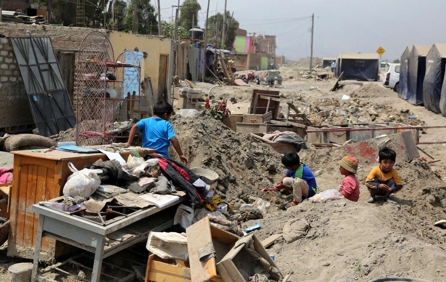 Children playing outside their home a month after torrential rains caused flooding and widespread destruction in Carapongo, Lima, Peru.