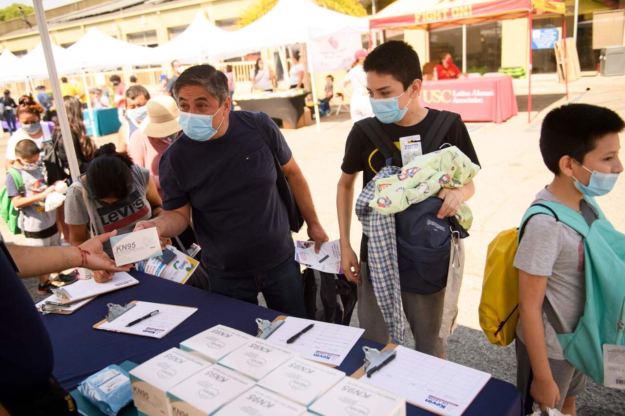 People receive boxes of KN95 face mask during a back to school event offering school supplies, Covid-19 vaccinations, face masks, and other resources for children and their families in Los Angeles on Aug 7, 2021.