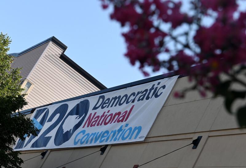 A banner of the Democratic National Convention hangs outside the Chase Center in Wilmington, Delaware on Aug 17, 2020.