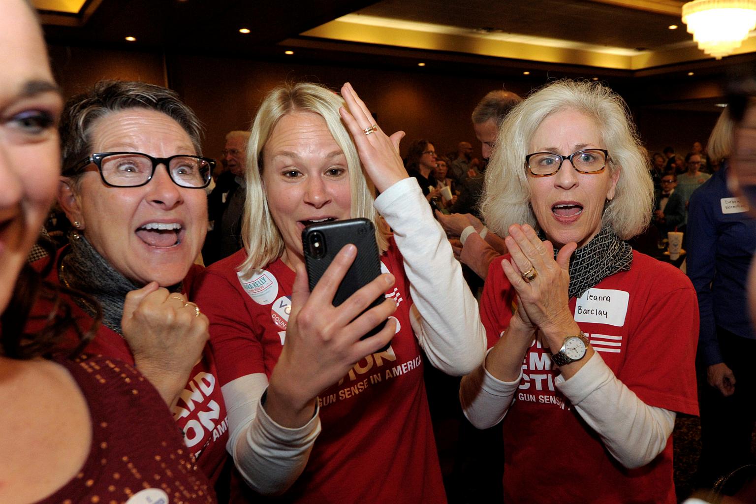 Democrats celebrate after candidate Laura Kelly was declared the winner over Kris Kobach at her election night party in Topeka, Kansas, on Nov 6, 2018.